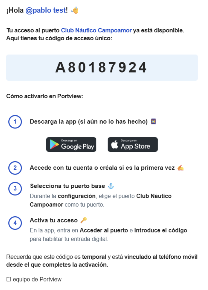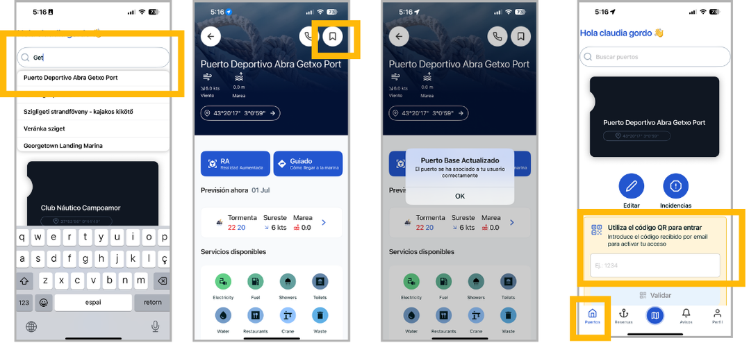 Una vez introducido y validado el código, el usuario quedará registrado correctamente y podrá acceder al puerto desde la app.