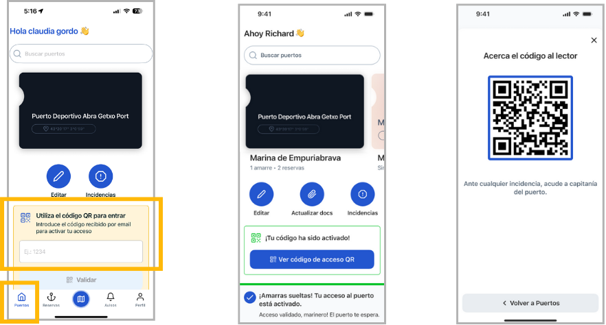 Solo tendrá que pulsar el botón “Acceder al puerto” desde la pantalla principal de su puerto base, acercando el QR al lector del acceso correspondiente.