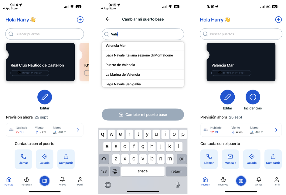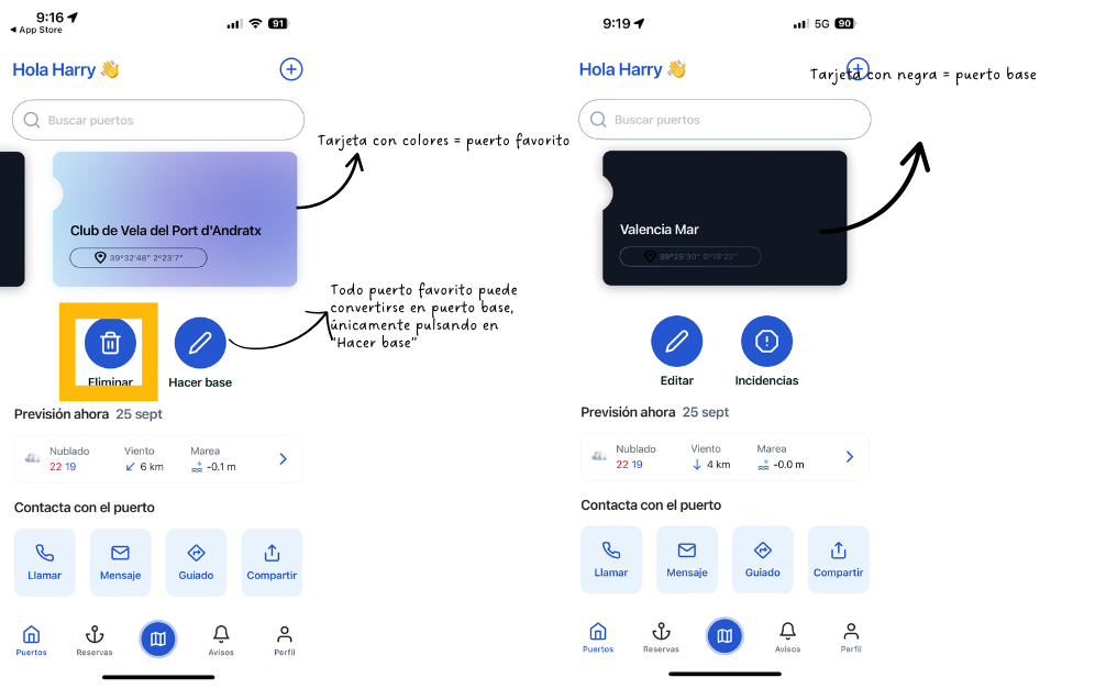 Puedes hacerlo tocando sobre el puerto en el mapa o desde la búsqueda.