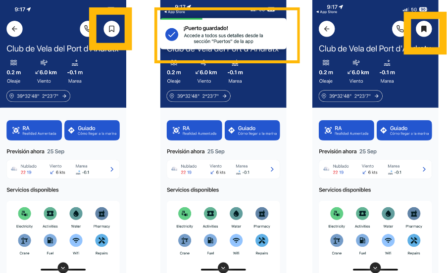 Verás una notificación indicando que el puerto ha sido guardado o eliminado como favorito.